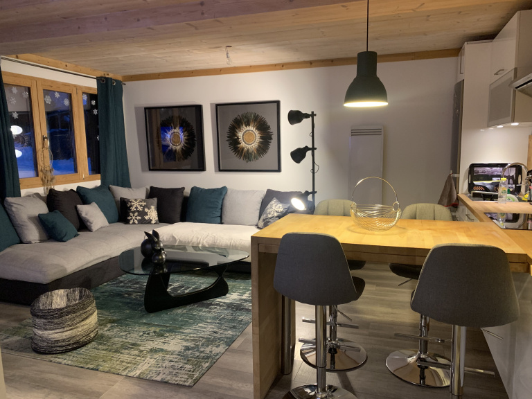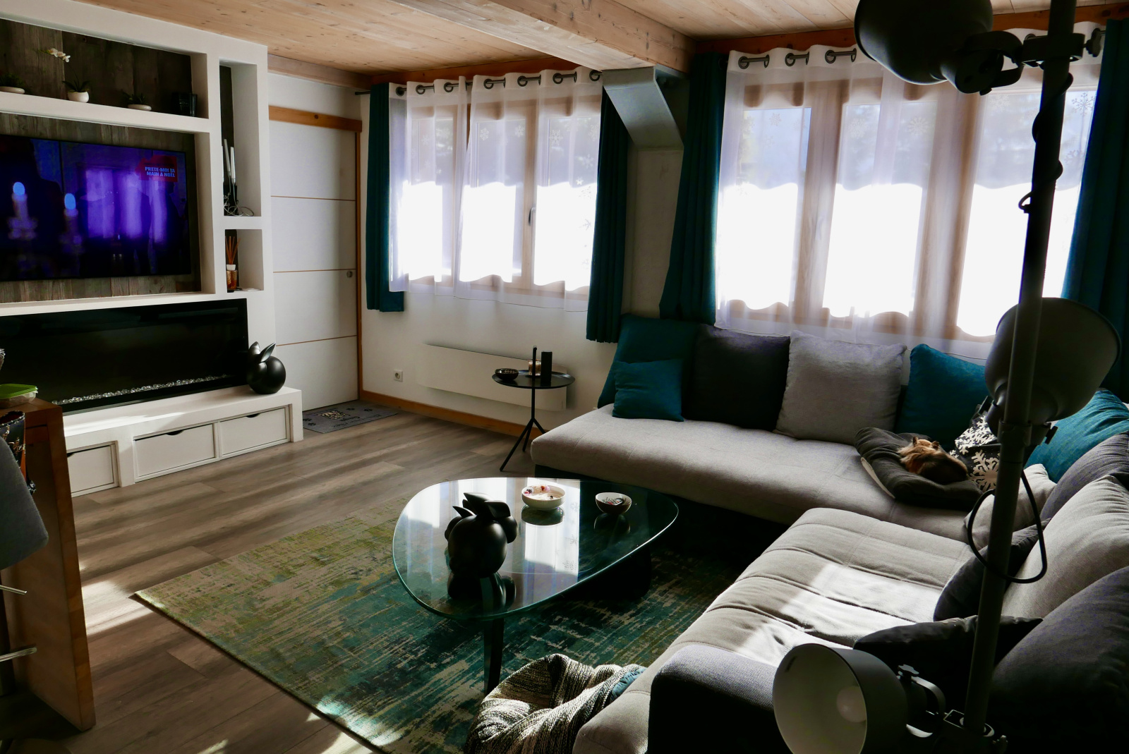 Un espace de vie chaleureux et moderne exposé plein sud, avec une cheminée éléctrique créant une ambiance cozy pour vos soirées d'hiver. Une cuisine américaine équipée fonctionnelle et contemporaine.