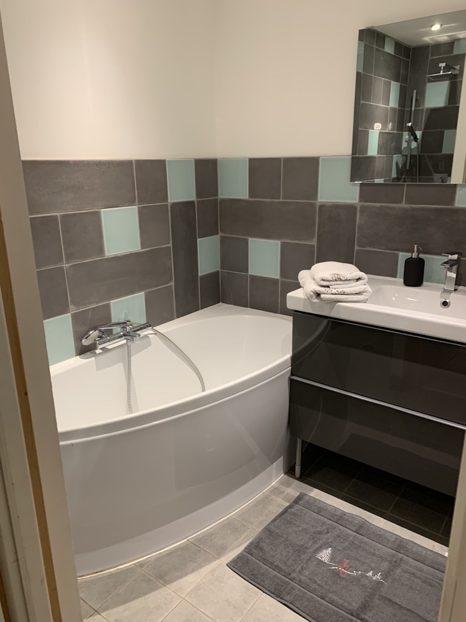 Salle de bain élégante, dotée d'une baignoire et d'une douche à l'italienne.